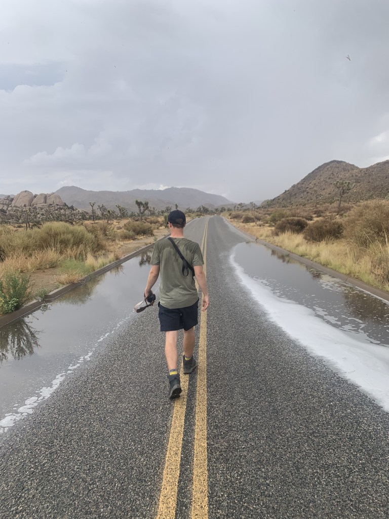 Barker Dam : une boucle d’environ 1h : Pendant cette balade, malgré un ciel dégagé quelques minutes plus tôt, une pluie diluvienne s’est abattue sur nous ! Vingt bonnes minutes d’averse et d’orage très localisé (à moins d’un kilomètre de là, les autres touristes nous regardaient avec des yeux ronds, trempés jusqu’aux os. Ils n’ont visiblement pas eu la même surprise que nous). Autant vous dire que nous avons eu peur, l’orage juste au-dessus de notre tête dans le désert ! Là où la pluie est tombée, la route et le parking étaient inondés ici et là. Ce phénomène va quand même nous suivre une bonne partie de notre voyage, et même s’il ne nous est pas tombé dessus au point de mettre notre vie en danger, nous avons quand même surveillé le ciel autant que possible par la suite.